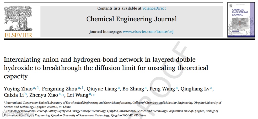近日,青岛科技大学王磊课题组肖振宇团队于Chemical Engineering Journal上发表了题为“Intercalating anion and hydrogen-bond network in layered double hydroxide to breakthrough the diffusion limit for unsealing theoretical capacity”的研究论文。该研究巧妙地利用电化学刻蚀的方法在层状氢氧化物中嵌入大量的OH-和H2O分子形成氢键网络,通过“牛顿摇篮”模型的快速传输,以降低电解质离子的扩散能垒。