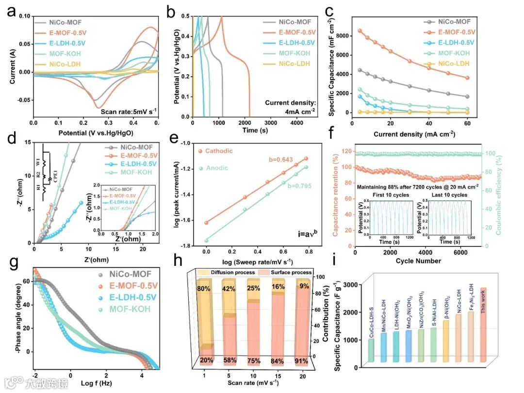 要点二:E-MOF-0.5V不仅继承了MOF母体高比表面积的特性,还利用在层间填充的H2O分子氢键网络,实现“牛顿摇篮”式的离子传输,其扩散速率比非电化学刻蚀样品高38倍。