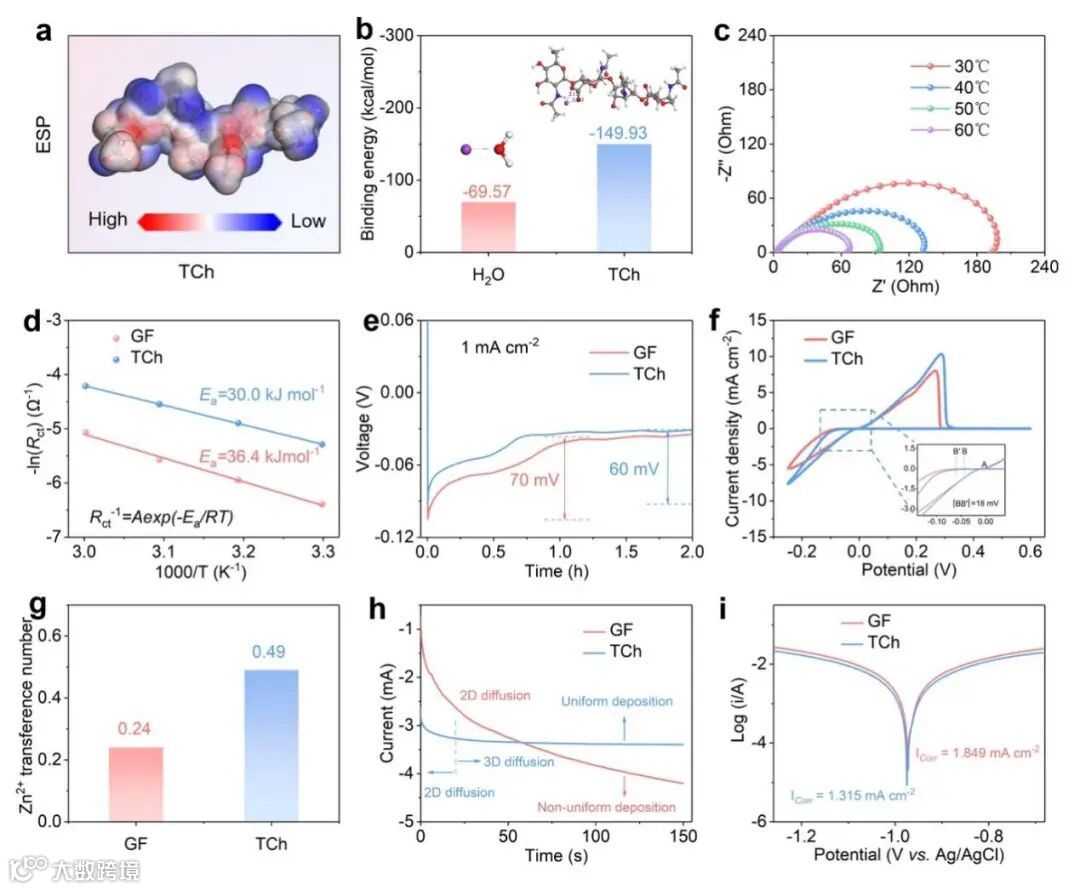 通过分子动力学模拟和电化学测试结构分析发现:TCh隔膜有助于Zn2+脱溶剂化、降低Zn2+的成核位垒、提升Zn2+转移数和均匀化Zn2+通量。与常用的玻璃纤维(GF)隔膜相比,TCh隔膜还可以降低锌金属负极的腐蚀电流。因此,TCh隔膜在抑制枝晶生长和副反应方面比GF隔膜更具有优势。