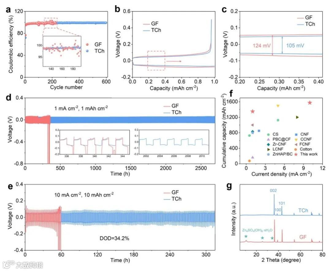 Zn-Cu半电池和Zn-Zn对称电池测试结果显示:使用TCh隔膜的电池中,锌负极表现出更高的可逆性和循环使用寿命。在1 mA cm−2的电流密度下,使用TCh隔膜的Zn-Zn对称电池可持续循环超过2700 h,即使在10 mAcm−2的高电流密度下,仍可循环320 h以上。循环后Zn片的XRD谱图表明TCh隔膜可有效抑制循环过程中副产物的生成。