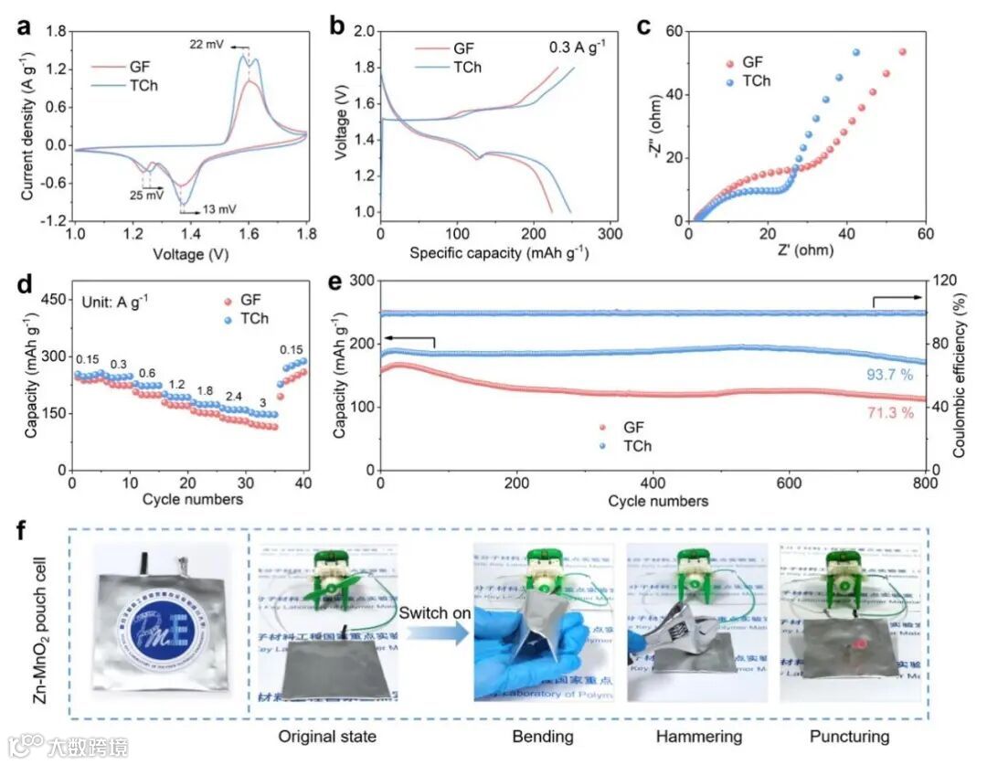 Zn-MnO2全电池的电化学性能测试结果表明:TCh隔膜可显著提高电池的循环稳定性和倍率性能。此外,由于TCh膜机械强度高兼具极佳的柔韧性,利用其组装的Zn-MnO2软包电池在多种外力作用下(如弯曲、锤击和穿刺等)仍然能保持较高的稳定性和安全性。