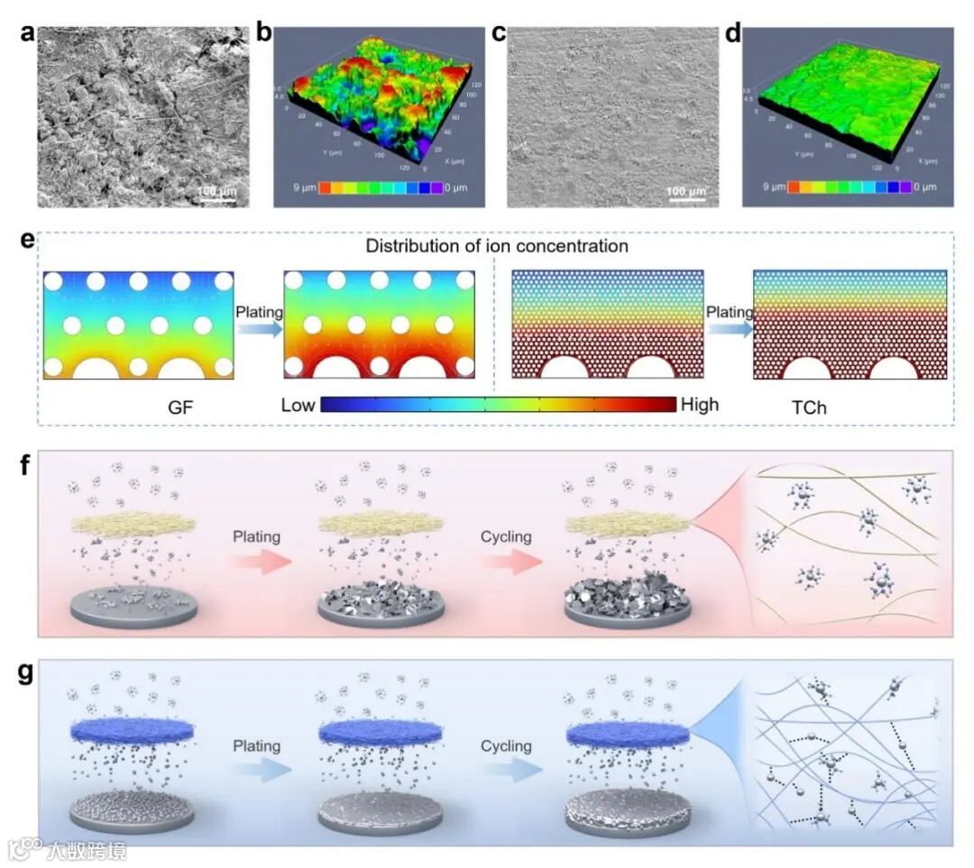 循环后的Zn片的SEM和激光共聚焦图片表明:TCh隔膜可以有效抑制锌枝晶产生,诱导Zn2+均匀沉积。TCh隔膜中的亲锌极性基团与Zn2+相互作用,能够促进水合Zn2+离子的脱溶和迁移。此外,TCh隔膜致密的微观结构可均匀化Zn2+通量,从而实现均匀的Zn2+沉积。因此,TCh隔膜有效抑制了Zn枝晶生长和副反应,提高了锌负极的使用寿命。