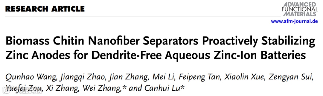 Qunhao Wang, Jiangqi Zhao, Jian Zhang, Mei Li, Feipeng Tan, Xiaolin Xue, Zengyan Sui, Yuefei Zou, Xi Zhang, Wei Zhang*, Canhui Lu*, Biomass Chitin Nanofiber Separators Proactively Stabilizing Zinc Anodes for Dendrite-Free Aqueous Zinc-Ion Batteries, Advanced Functional Materials, 2024, 2405957.