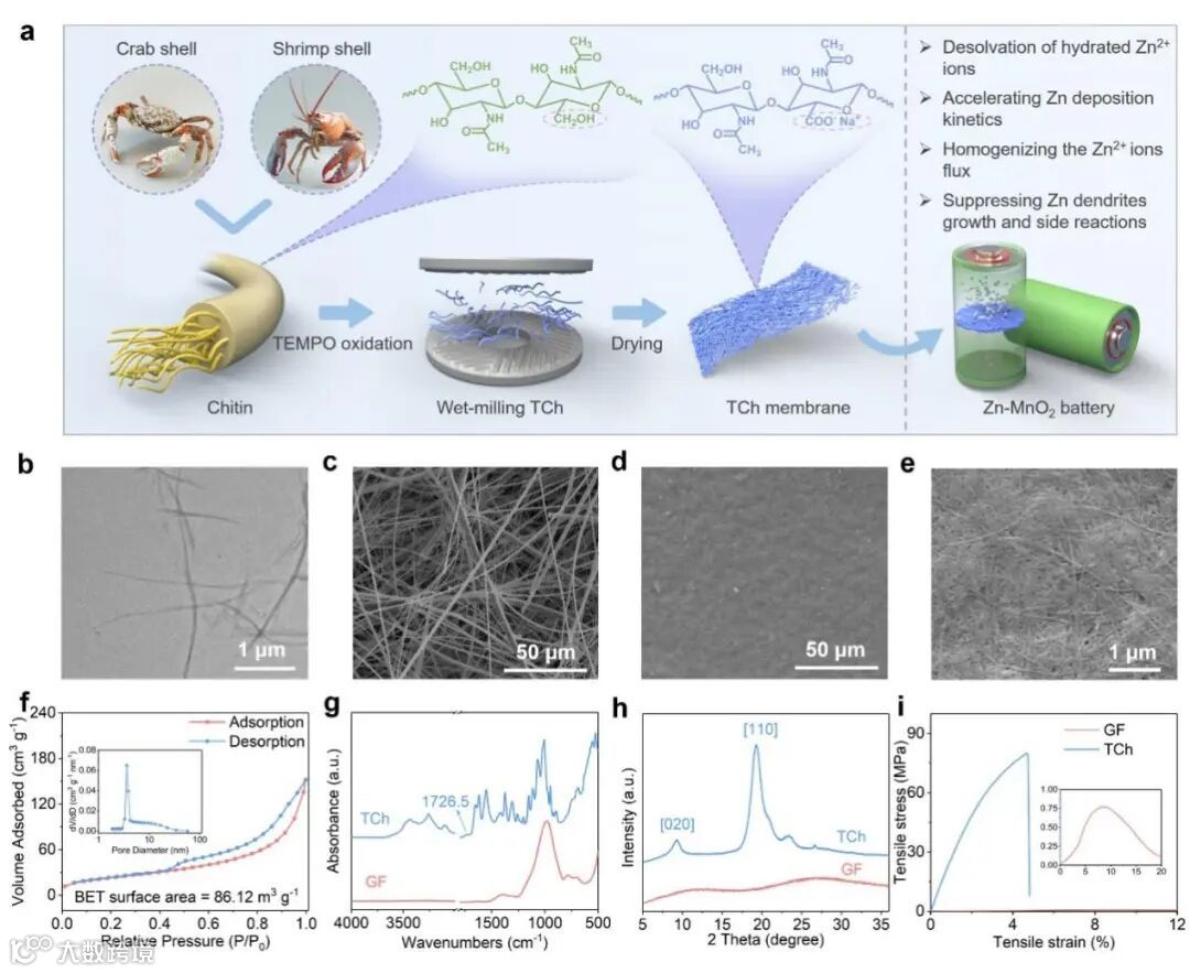 采用天然生物质虾壳和蟹壳为原料,通过简单的湿磨加工,在循环高剪切力作用下,机械剥离获得甲壳素纳米纤维悬浮液,然后经溶液浇筑和室温干燥制备出柔性TCh隔膜。该隔膜力学性能优异,具有均匀的纳米孔隙结构、丰富的亲锌极性基团-COOH、-OH和-O=C-N-H。