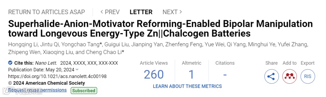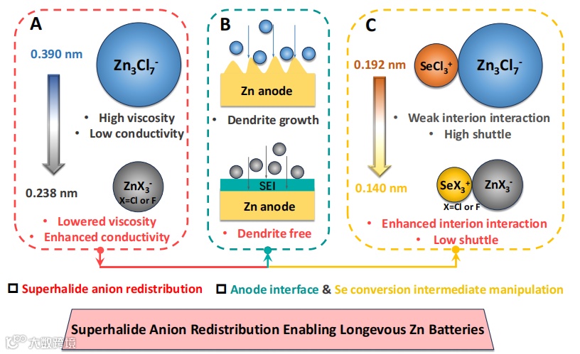 近日,广东工业大学李成超教授团队在国际知名期刊Nano Letters上发表题为“Superhalide-Anion-Motivator Reforming-Enabled Bipolar Manipulation toward Longevous Energy-Type Zn||Chalcogen Batteries”的研究论文。该论文提出了一种超卤阴离子诱导重构策略,同时调控了锌负极界面和硒(Se)转化中间体,初步取得了长寿命、高能量密度的锌电池。在该工作中,将ZnF2作为添加剂,可将锌基ILs电解液中半径较大的超卤锌酸根阴离子进一步解离为小半径较小的活性络合离子,显著提升了电解液的离子电导率和流动性。同时,在电池充放电过程中,含氟(F)超卤锌酸根阴离子有助于形成稳定的负极固体电解质界面(SEI),有效遏制了锌枝晶生长。此外,含F超卤锌酸根阴离子诱导多种离子半径较小的Se转化中间体形成,增强了阴阳离子间的库伦相互作用,从而有效缓解了穿梭效应(图1)。