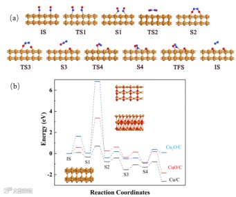 图2. NO+CO反应的可能途径。(a)两个NO分子的聚合、旋转和ONNO物质的分解。(b)Cu2O/C、CuO/C和Cu/C样品的电位,其中蓝色、红色和黄色球体分别代表N、O和Cu原子。