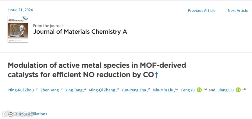相关研究以“Modulation of Active Metal Species in MOF-derived Catalysts for Efficient NO Reduction by CO”为题,发表在《Journal of Materials Chemistry A》上。该论文的第一作者为石河子大学化学化工学院硕士研究生周宁瑞,通讯作者刘敏敏副教授,于锋教授和刘江教授。