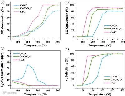 图1. CuO/C、Cu-CuOx/C和Cu/C催化剂在CO-SCR反应中的催化活性:(a)NO转化率与反应温度的函数关系,(b)N2O浓度,(c)CO转化率,(d)N2选择性(反应条件:[NO]= 500 ppm,[CO]=1000 ppm,[O2] =1%,N2平衡,GHSV=30000 h-1)