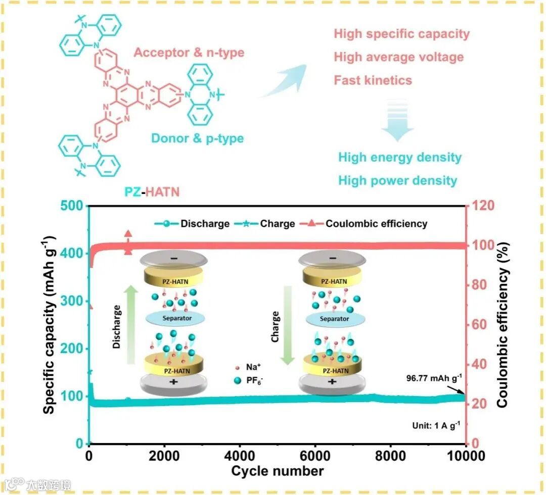 近期,来自北京理工大学的姚长江团队在Energy Storage Materials发表了题为“Integrating dual-ion storage and D - A effect into a nitrogen-rich polymer for symmetric all-organic sodium batteries”的研究论文。文中针对钠离子电池发展需求,设计合成了兼具双离子存储和 D-A 结构的 PZ-HATN 双极聚合物电极材料。该材料融合 n 型 HATN 和 p 型 PZ,提供丰富活性位点并提升电极电位,其 D - A 结构优化电子传输。实验表明,PZ-HATN 正极在不同电流密度下展现高容量和功率密度,全有机对称电池以其为电极材料也呈现出高容量、出色循环稳定性和倍率性能。此研究为有机电极材料开发提供新思路,助力高性能全有机钠离子电池发展。