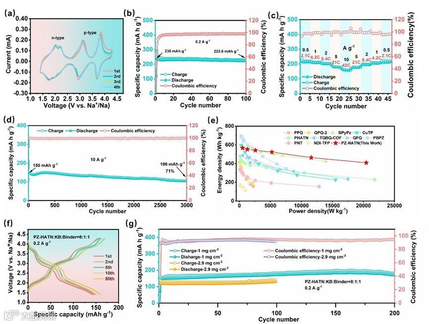 PZ-HATN 正极具有出色的电化学性能。在半电池测试中,于 0.2 A g⁻¹ 下放电容量可达 235 mAh g⁻¹,接近理论容量,在 10 A g⁻¹ 时仍保持 157 mAh g⁻¹,实现了 20.4 kW kg⁻¹ 的超高功率密度与 409.0 Wh kg⁻¹ 的能量密度。循环伏安曲线显示其初始四周期几乎重叠,反应稳定可逆,拥有多对可逆氧化还原峰。在循环性能方面,100 次充放电后容量保持率达 95%,库仑效率近 99%,在 10 A g⁻¹ 下 3000 次循环后容量保持率为 71%。在大电流密度下表现出高倍率性能,且随着质量负载增加仍能保持一定容量,展示出其在实际应用中的潜力。