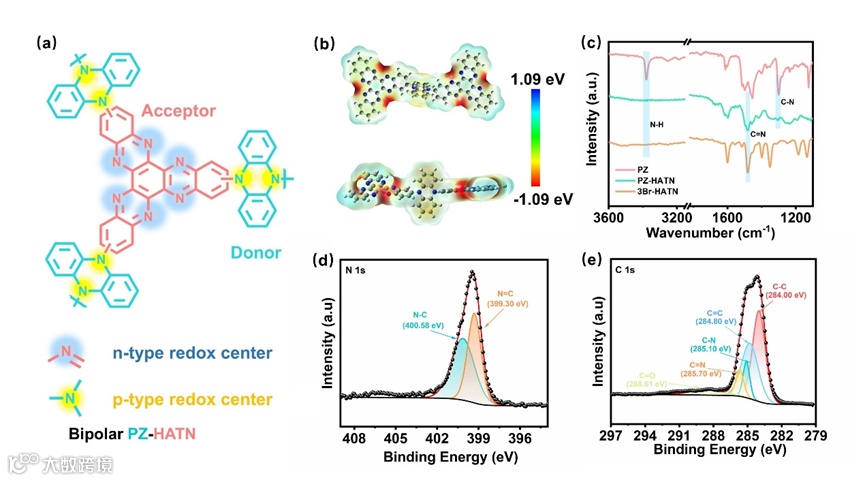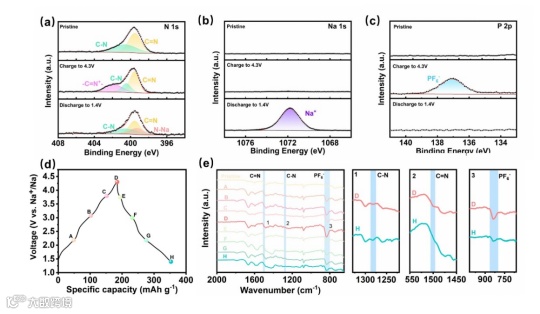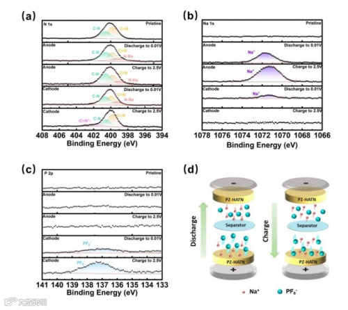 PZ-HATN 的储能机理通过多种表征手段得以揭示。XPS 分析表明,充电时 N 1s 谱图中 401.88 eV 处出现与 -C-N⁺相关的峰,放电时消失,证实了 N 自由基阳离子与阴离子的相互作用;Na 1s 和 P 2p 谱图分别显示出 Na⁺的插入 / 脱出以及 PF₆⁻的可逆存储信号。EDS 分析发现充电时 F 和 P 元素含量增加、Na 元素减少,放电时相反,进一步证明离子存储的可逆性。FT-IR 结果显示,1280 cm⁻¹ 的 C-N 伸缩振动峰及 830 cm⁻¹ 的 PF₆⁻特征峰强度随充放电过程变化,表明 N 在 PZ 单元中作为 PF₆⁻存储的活性位点,且 C=N 峰也与 Na⁺的嵌入 / 脱出过程相对应。