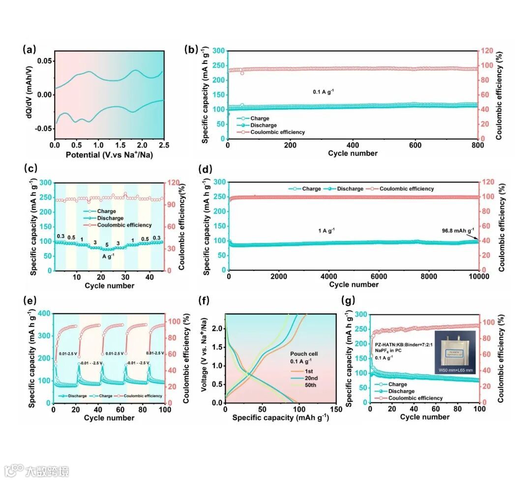 全有机对称电池展现出优异的电化学性能。以 PZ-HATN 为电极材料构建的对称电池,在 0.1 A g⁻¹ 下循环 800 次后,比容量保持在 110.3 mAh g⁻¹ 且无衰减,体现出出色的循环稳定性。在倍率性能方面,从 0.1 A g⁻¹ 到 5 A g⁻¹ 都有良好表现,5 A g⁻¹ 时仍能保持 79 mAh g⁻¹ 的容量。在高电流密度 1 A g⁻¹ 下进行 10,000 次循环后,容量保持率为 92%(97 mAh g⁻¹)。极性反转实验中,在 0.2 A g⁻¹ 下也能维持约 80 mAh g⁻¹ 的稳定容量,进一步验证其双极性特征。与文献中代表性的 SAOBs 相比,PZ-HATN 构建的电池在循环稳定性和倍率性能上优势明显,并且全有机软包电池也能在 0.1 A g⁻¹ 下循环超 100 次,初始放电容量达 94 mAh g⁻¹,与纽扣电池性能相当,展示出良好的实际应用潜力。