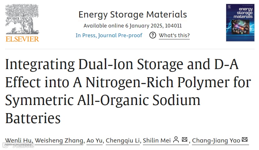 Wenli Hu, Weisheng Zhang, Ao Yu, Chengqiu Li, Shilin Mei, Chang-Jiang Yao,Integrating Dual-Ion Storage and D-A Effect into A Nitrogen-Rich Polymer for Symmetric All-Organic Sodium Batteries, Energy Storage Materials, 2025, 104011.