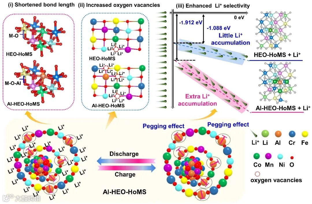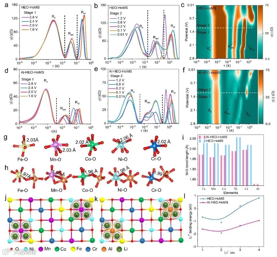图5. Al-HEO-HoMS中的缩短的金属-氧键长以及降低的Li+结合能。