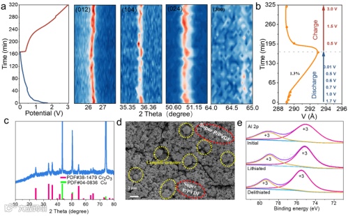 通过原位XRD深入研究了Al-HEO-HoMS负极在循环过程中的晶体结构演变规律。如图3a所示,在嵌锂/脱锂过程中,材料的主要衍射峰发生可逆的晶格变化,这种变化有效缓解体积膨胀并防止结构坍塌,为Li⁺的稳定迁移提供有利条件。图3b显示Al-HEO-HoMS电极材料在充放电循环后的晶胞体积变化率仅为1.3%。这与Al掺杂缩短键长、增强晶格结构稳定性的作用密切相关,同时Al-O键的"锚定效应"有效强化了材料骨架结构。循环100次后电极的XRD图谱(图3c)显示材料仍保持刚玉型结构,SEM图像(图3d)证实Al-HEO-HoMS电极材料维持完整球形形貌。图3e中Al元素在不同状态下的XPS谱图显示其峰形与结合能位置保持一致,证明Al元素始终以+3价稳定存在,未参与氧化还原反应。
