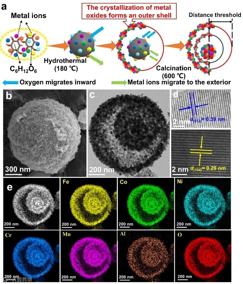 Al-HEO-HoMS的制备基于原位生成的无定形碳球模板结合热扩散法(图2a)。在水热过程中,Fe3+、Co2+、Ni2+、Mn2+、Cr3+、Al3+等金属阳离子作为交联剂,与葡萄糖分子中的多个羟基(-OH)形成配位键,最终生成包裹金属离子前驱体的无定形碳球。在高温热扩散阶段,热环境诱导碳球发生非均匀收缩,同时柯肯达尔效应促使金属离子在碳球内部呈现差异化扩散行为。这种动力学差异最终构建出独特的中空多壳层纳米结构。如图2b所示,Al-HEO-HoMS呈现单分散微球结构,粒径约1.0 μm。TEM图像(图2c)清晰展示了微球的中空多壳层结构。HRTEM图(图2d)显示材料具有清晰的晶格条纹(晶面间距约0.39 nm和0.29 nm,分别对应刚玉型结构Cr2O3的(012)和(104)晶面,PDF#38-1479),表明材料结晶性良好。通过HAADF和能谱面扫分析(图2e)可见,Fe、Co、Ni、Cr、Mn、Al和O元素在空心多壳层结构中均匀分布,未出现元素偏析,证实Al元素成功均匀掺杂。