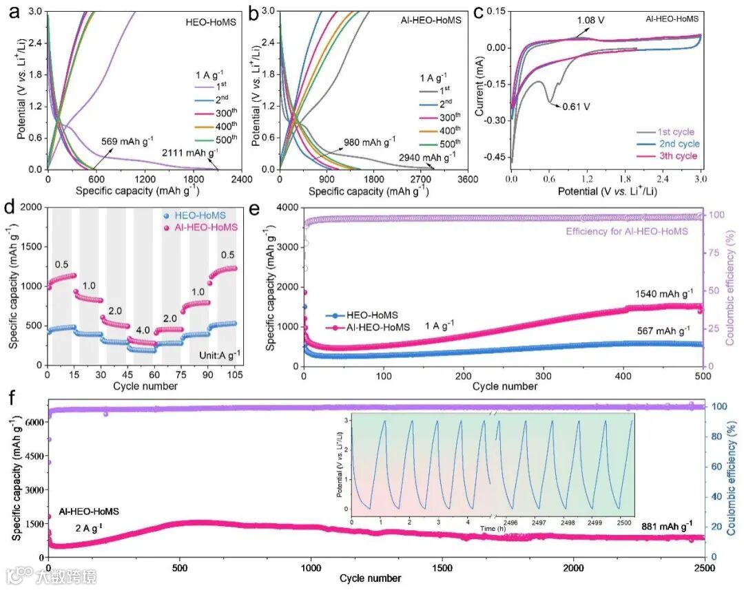 得益于惰性元素和结构设计的协同作用,得到的Al-HEO-HoMS负极材料表现出显著优异的电化学储锂性能包括较高的初始放电比容量(图6a-b)、出色的倍率性能(图6d)以及长周期循环稳定性(图6e-f),在1 A g-1下经过500次循环后,Al-HEO-HoMS的比容量为1540 mAh g-1,是HEO-HoMS(567 mAh g-1)的三倍。这可以解释为晶格内的Al-O结构作为固定点,牢固地铆接其他金属元素,在提高Al-HEO-HoMS材料的稳定性方面发挥着关键作用。在2 A g-1的高电流密度下经过2500次循环后,其保持了令人印象深刻的881 mAh g-1的可逆充电容量,容量保持率为99.8%(图6f)。这些发现表明,Al-HEO-HoMS阳极可以表现出卓越的循环可逆性,满足市场对快速放电的需求。