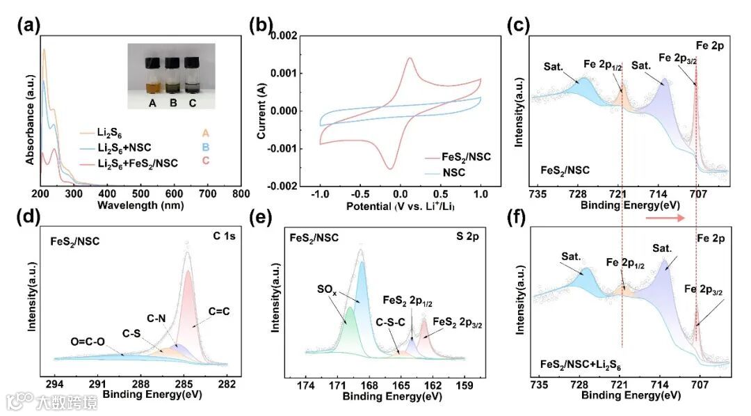 可视化吸附性实验验证了FeS2/NSC对LiPSs具有最强的吸附能力,对称电池显示了FeS2/NSC的优异催化作用,吸附前后的XPS对比图中,吸附LiPSs后,Fe的2p轨道向高结合能的方向移动。这一关键性的变化表明FeS2/NSC与LiPSs之间存在强的化学相互作用,有利于抑制多硫化物的穿梭。