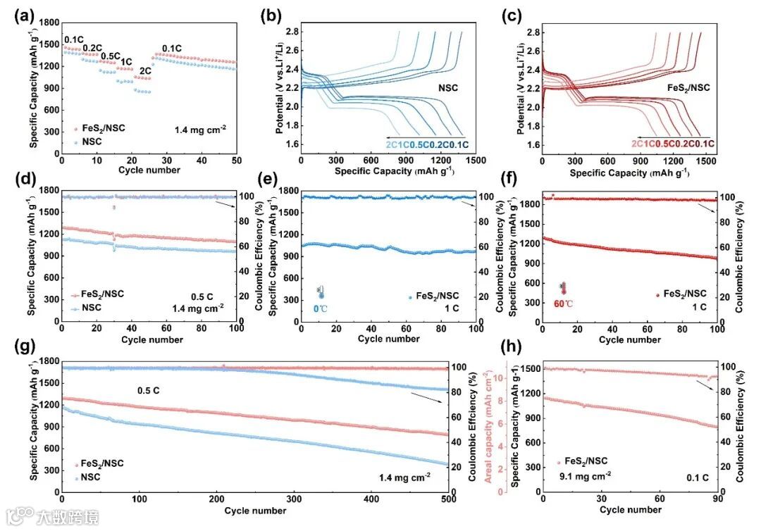 FeS2/NSC隔膜修饰层的锂硫电池表现出良好的电化学性能,在不同倍率下有良好的循环稳定性。将电池循环30圈后搁置72 h对其进行自放电测试,测试结果显示, FeS2/NSC 的容量衰减率(6.7%)低于 NSC 的容量衰减率(8.3%)。因此FeS2/NSC隔膜修饰层的电池能实现LiPSs的高效催化转化,有效抑制穿梭效应,降低自放电发生率。在长循环、高硫载和高低温下,FeS2/NSC依旧展现出良好的循环稳定性。因此,FeS2/NSC材料作为一种优良的隔膜改性材料,为锂硫电池的全天候使用和商业化提供了新的可能性。