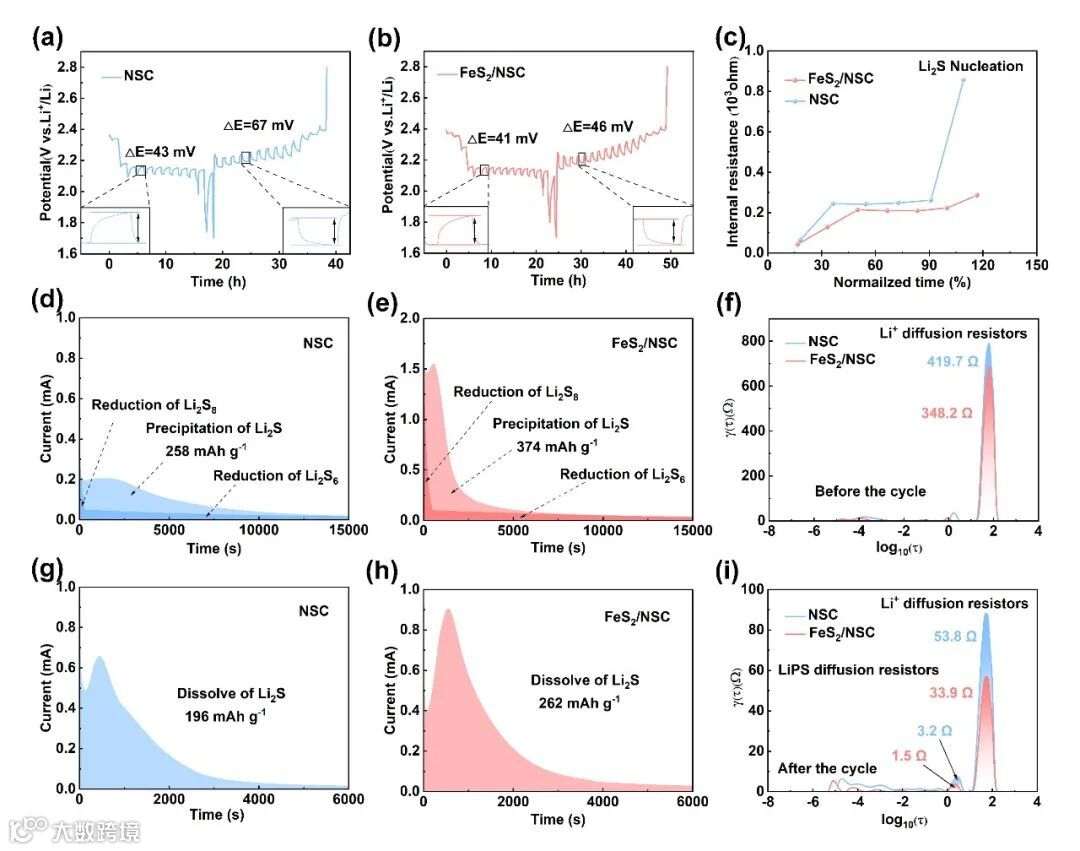 Fig. 4. Galvanostatic intermittent titration (GITT) curves of the cells with (a) NSC and (b) FeS2/NSC. (c) Intrinsic barrier to cell nucleation compared to the standardized discharge-to-charge duration. Li2S deposition characteristics of the cells with (d) NSC and (e) FeS2/NSC. Li2S dissolution characteristics of the cells with (g) NSC and (h) FeS2/NSC. (f) and (i) The dispersion of relaxation time graph in impedance spectroscopy.