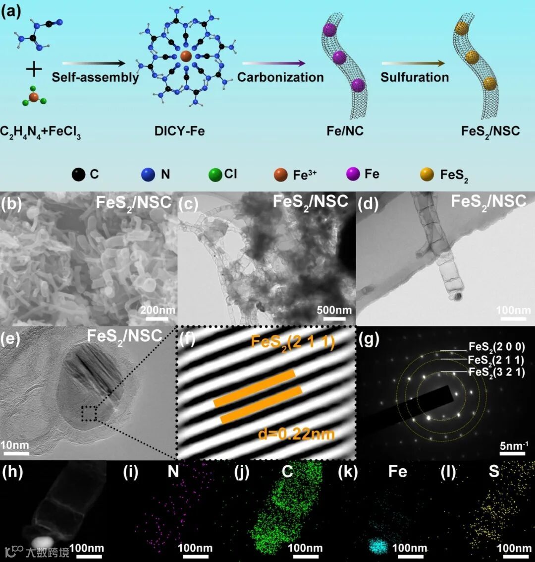 Fig. 1. (a) Diagrammatic representation of materials synthesis. (b) SEM image, (c)-(d) TEM images, (e) HRTEM image, (f) Inverse FFT lattice image, SAED diffraction pattern, and (h-l) EDS elements mapping images of FeS2/NSC.