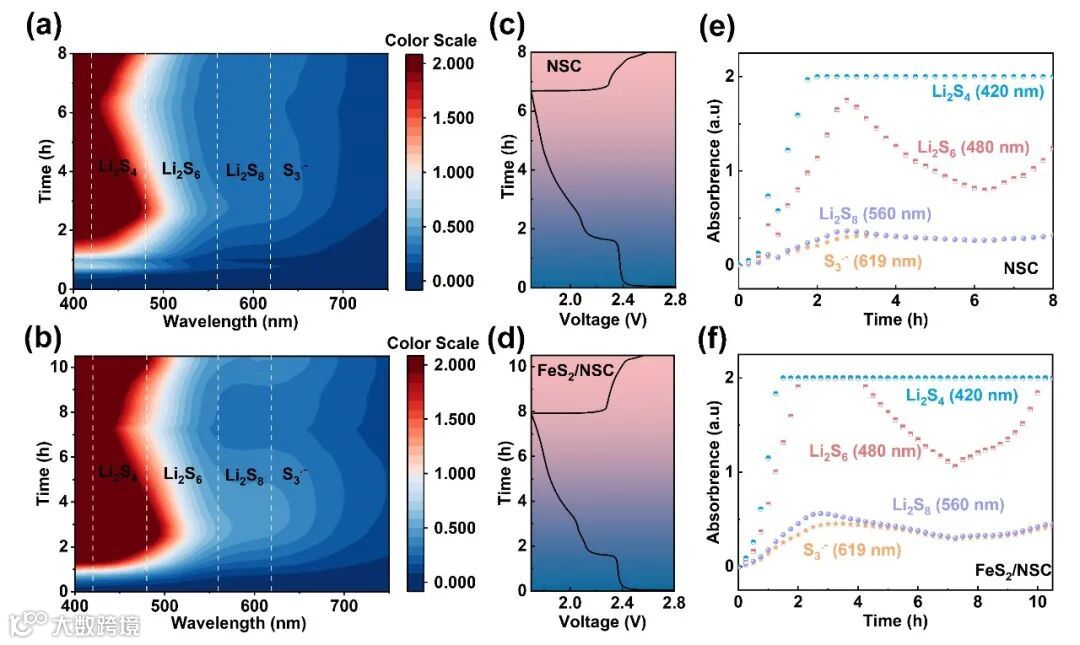 Fig. 6 (a) In-situ UV-vis test, (c) Voltage profiles and (e) Absorbance data of the dissolved LiPSs with NSC/S. (b) In-situ UV-vis test, (d) Voltage profiles and (f) Absorbance data of the dissolved LiPSs with FeS2/NSC/S.