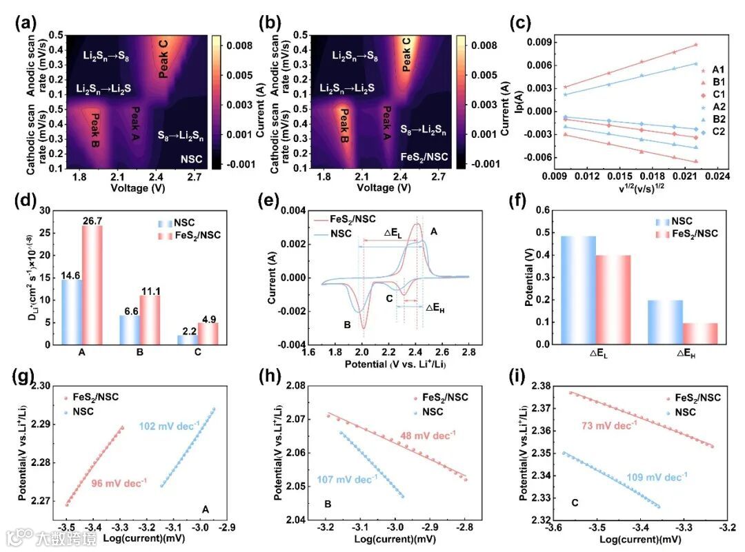 Fig. 2. Contour plots of CV patterns for (a) NSC and (b) FeS2/NSC with different scan rates. (c) Linear correlation of Ip with ν1/2. (d) Comparative bar chart of Li+ diffusivity. (e) CV curves comparison at 0.1 mV/s. (f) ΔEH and ΔEL comparison. (g-i) Tafel curves of peaks A, B, C corresponding to CV curves.
