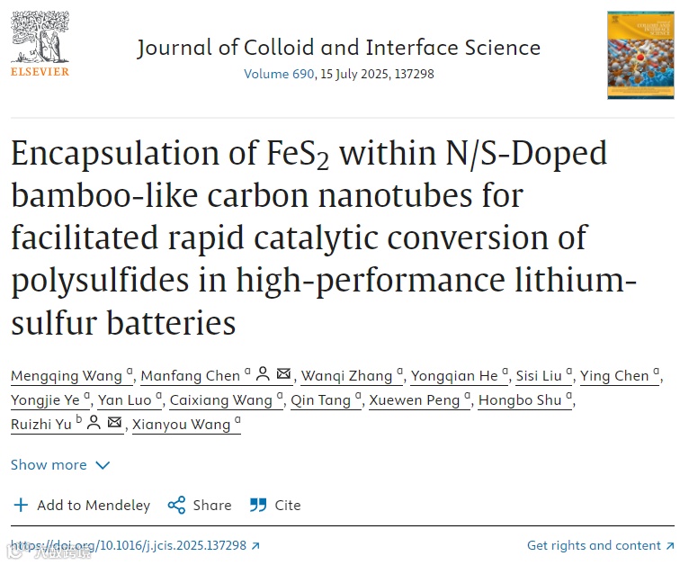 Encapsulation of FeS2 within N/S-Doped bamboo-like carbon nanotubes for facilitated rapid catalytic conversion of polysulfides in high-performance lithium-sulfur batteries, J. Colloid Interface Sci, 2025: 137298.