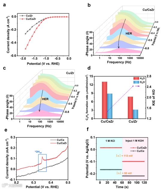 图4. 机理分析。(a)Ar气氛下 1.0 M KCl的流动池中Cu/Zr、Cu/CeZr的LSV曲线。(b) Cu/CeZr在饱和氩气1.0 M KCl中−0.1 ~−0.9 V电压范围内的原位波特图。(c) Cu/Zr在饱和氩气1.0 M KCl中−0.1 ~−0.9 V电压范围内的原位波特图。(d)在1.0 M KCl电解液的流动电池中,−1.9 V时Cu/CeZr和Cu/Zr的动力学同位素效应。(e) Cu/CeZr和Cu/Ce的*OHadCV曲线。(f)Cu/CeZr和Cu/Ce注入3ml 1.0 M KOH前后,在1.0 M KCl溶液中测量的开路电位。