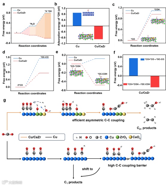 图5. DFT计算。(a) H2O在Cu/CeZr和Cu表面的解离自由能。(b) *OH在Cu和Cu/CeZr上的吸附能;附图显示了*OH在Cu和Cu/CeZr上的吸附构型。(c) Cu和Cu/CeZr上*CO加氢成*COH的自由能;附图为Cu/CeZr上*CO加氢成*COH的吸附构型。(d) Cu和Cu/CeZr上2*CO到*OC-CO的自由能。(e) Cu和Cu/CeZr上*CO-*COH到* OC-COH的自由能;附图显示了*CO和*COH在Cu/CeZr上的吸附构型。(f) Cu/CeZr上两种C-C耦合步骤的自由能比较。(g) Cu和Cu/CeZr上的C-C耦合路径示意图。