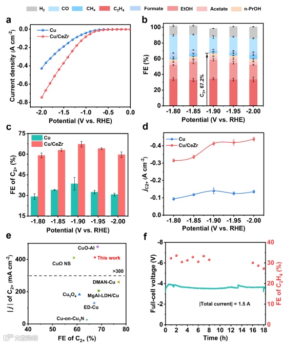 图2. CO2电还原性能。(a) Cu/CeZr和Cu的LSV曲线。(b) 在1.0 M KCl电解液中Cu/CeZr在不同电位下的法拉第效率。(c)不同施加电位下C2+产物法拉第效率的比较。(d)不同外加电位下Cu/CeZr和Cu的jC2+。(e)中性电解质下不同催化剂的性能比较。(f) Cu/CeZr催化剂的长期CO2电解实验。
