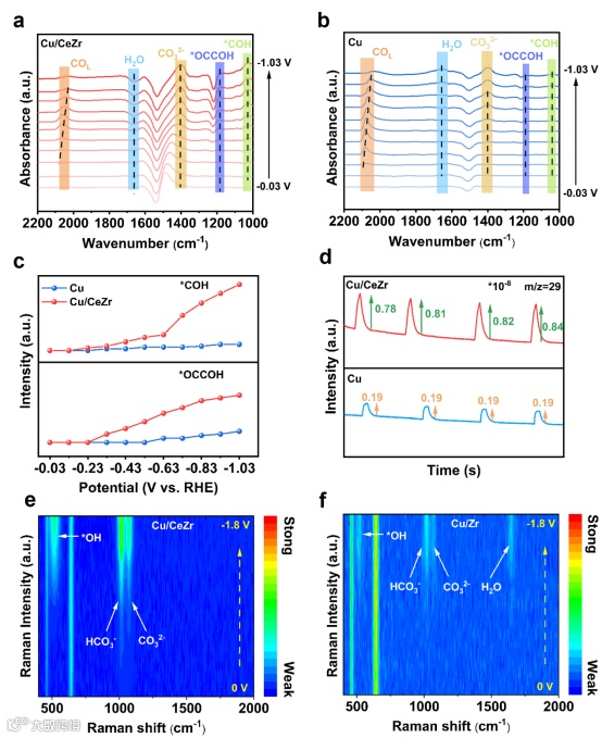 图3. CO2RR过程中Cu和Cu/CeZr的原位表征。(a) Cu/CeZr、(b) Cu在不同电位下的原位FTIR光谱。(c) Cu/CeZr和Cu上*COH和*OCCOH的强度。(d) Cu/CeZr和Cu在1.0 M KCl电解液中连续4个周期在−0.9 V电压下原位DEMS测量的29 (*COH) m/z信号。(e) Cu/CeZr、(f) Cu/Zr电极分别在0 ~−1.8 V下获得原位SERS光谱。