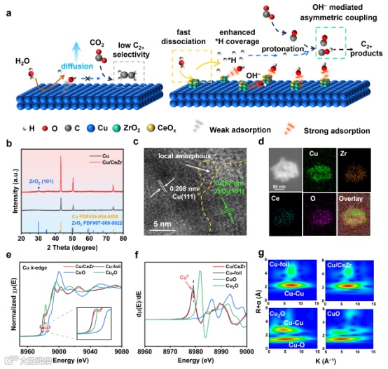 图1. Cu/CeZr的合成与表征。(a) 纯Cu和Cu/CeZr电极反应机理示意图。(b) Cu/CeZr和Cu的XRD谱图。(c) Cu/CeZr的HRTEM图像。(d) Cu、Zr、Ce、O在Cu/CeZr上的元素映射。(e) Cu/CeZr、Cu箔和标准CuO、Cu2O样品的归一化k边X射线吸收近边光谱。(f) d(E)/dE。(g) 标准Cu箔、Cu2O、CuO和Cu/CeZr样品的小波变换图。