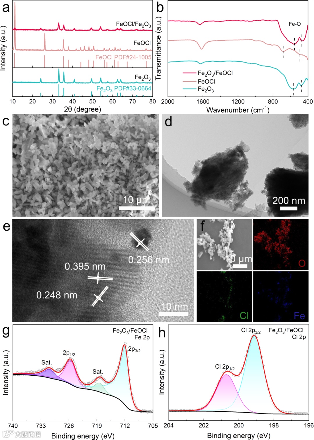 图2展示了以NaCl为模板所制备的Fe2O3、FeOCl和Fe2O3/FeOCl的XRD、FT-IR及Fe2O3/FeOCl的形貌表征及表面成分结果。