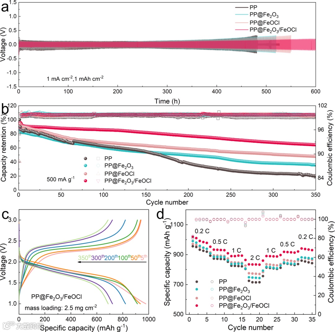 图5通过探究相应锂对称和锂硫电池的倍率和长循环等电化学性能来系统评估了Fe/Li2O/LiCl混合电子/离子导电层对于抑制锂枝晶生长的影响。