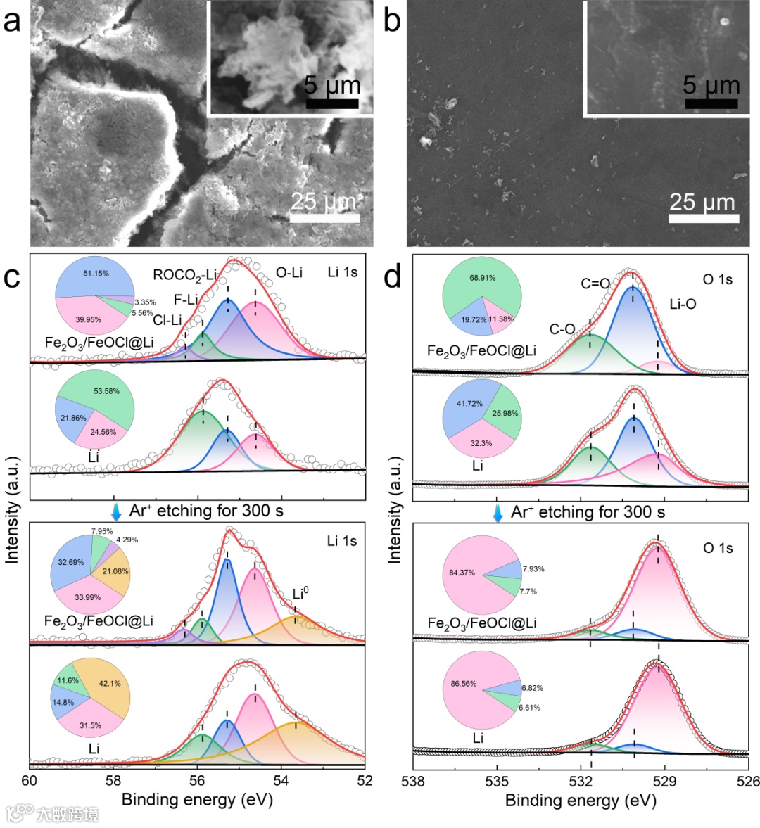 图4展示了Fe/Li2O/LiCl混合电子/离子导电层对锂枝晶的抑制作用,并利用刻蚀前后X射线光电子能谱(XPS)深度探究了Fe/Li2O/LiCl混合电子/离子导电层对于锂负极的保护作用。