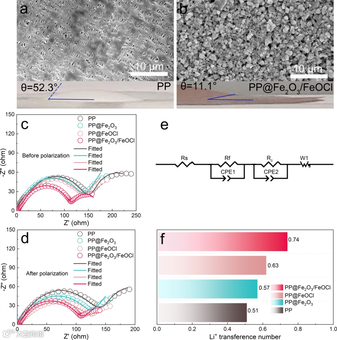 图3展示了涂覆Fe2O3/FeOCl涂层后对电解液的亲和性,并利用EIS和锂离子迁移数进一步揭示了Fe/Li2O/LiCl混合电子/离子导电层实现了快速的电子/离子运输。