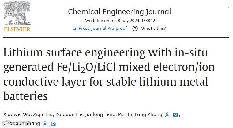 近日,来自武汉工程大学的商超群教授等人,在知名期刊Chemical Engineering Journal上发表题为“Lithium surface engineering with in-situ generated Fe/Li2O/LiClmixed electron/ion conductive layer for stable lithium metal batteries”的研究性文章。