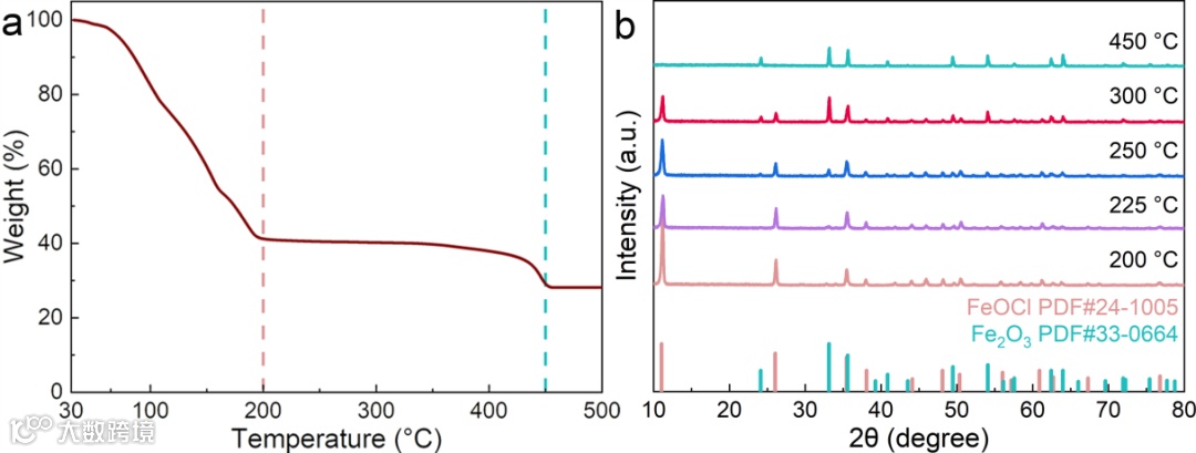 图1展示了空气气氛下FeCl3·6H2O的热重曲线和不同焙烧温度下相应产物的X射线衍射图。