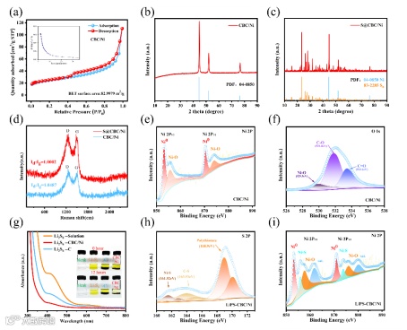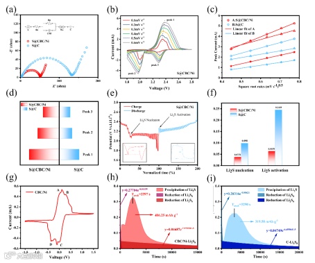 CBC@Ni复合材料呈现出清晰的碳骨架,三维交联的网状纤维碳网络缩短了离子和电子转移路径并有效缓解了硫体积膨胀问题,均匀生长的Ni纳米催化位点进一步加快 LiPSs转化。碳纤维网络空间限制与金属位点化学吸附协同作用亦有利于对LiPSs的吸附作用。