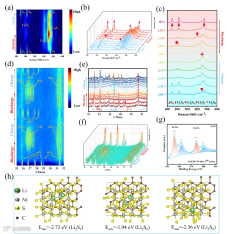 要点三:原位XRD结合原位Raman及非原位XPS,揭示锂硫电池体系中 Ni纳米催化剂的原位化学态转变,原位生成的新活性中心 NiS2 亦展现出良好的多硫化物吸附特性。