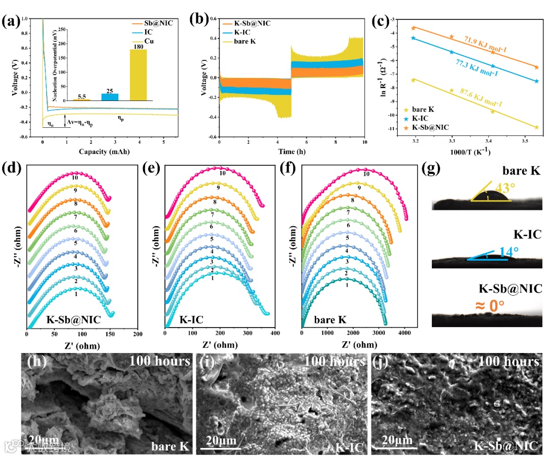 图2. a) K 在 Sb@NIC@Cu、IC@Cu 和Cu上的成核/电镀行为。b) 对称电池在 0.5 mA cm-2/0.5 mAh cm-2 条件下的 GITT 曲线。d-f) K-Sb@NIC、K-IC 和bare K 在 K+连续沉积过程中的原位 EIS 图。g) K-Sb@NIC、K-IC、bare K 阳极与电解液的接触角。h) bare K、i) K-IC 和 j) K-Sb@NIC 对称电池在 0.5 mA cm-2/0.5 mAh cm-2 条件下循环 100 小时后的形貌的SEM图像。