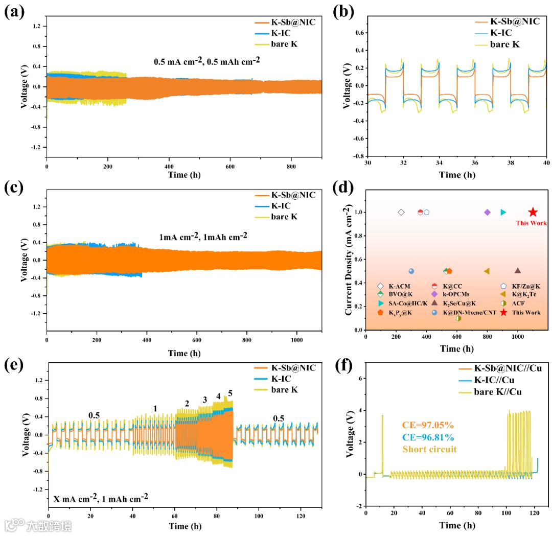 图2. a) 对称电池在 0.5 mA cm-2/0.5 mAh cm-2 和 c) 1.0 mA cm-2/1.0 mAh cm-2 条件下的循环性能。b) 图a) 中 30-40h放大后的时间电压曲线。d) K-Sb@NIC 与其他先进K金属阳极的循环性能比较。e) 对称电池在不同电流密度下的倍率性能。f) K-Sb@NIC//Cu、K-IC//Cu 和bare K//Cu 半电池在 0.5 mA cm-2/0.5 mAh cm-2 条件下的时间电压曲线,用于计算平均 CE。
