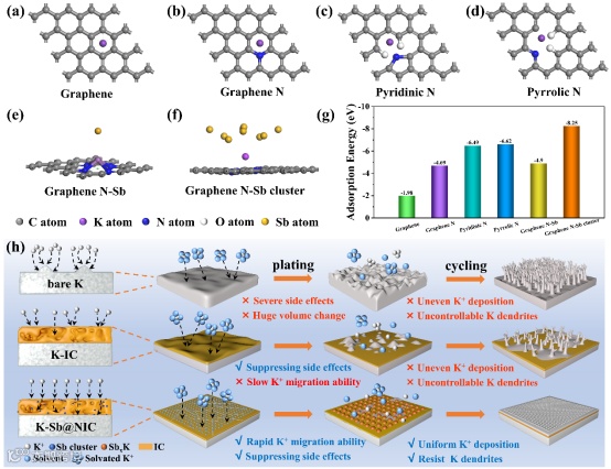 图4. a) K 在 a) 纯石墨烯、b) 石墨烯 N、c) 吡啶 N、d) 吡咯 N、e) 石墨烯 N-Sb 和 f) 石墨烯 N-Sb 团簇上的吸附能的计算模型。h) K在bare K、K-IC 和 K-Sb@NIC 电极电镀和循环过程的示意图。
