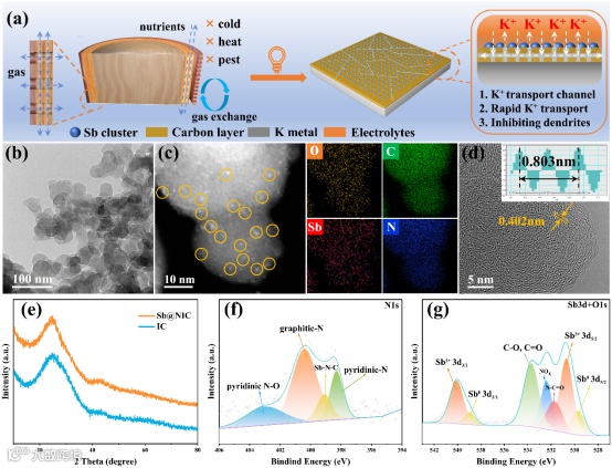 图1. a) 受树皮启发的功能碳/K复合电极示意图。b) Sb@NIC 的 TEM 图像。c) Sb@NIC 的 HAADF-STEM 图像和 EDS 图像。d) Sb@NIC 的 HRTEM 图像。e) Sb@NIC 和 IC 的 XRD 谱图。f) Sb@NIC 的 N 1s 和 g) Sb 3d+O 1s 的高分辨率 XPS 谱图。
