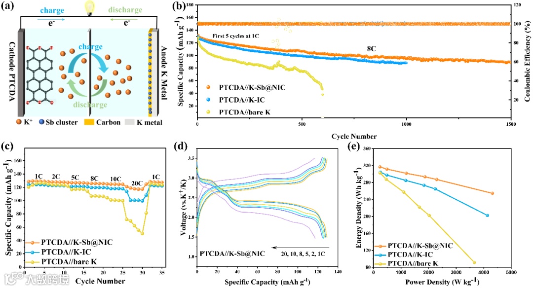 图4. a) PTCDA//K-Sb@NIC 全电池的示意图。b) PTCDA//K-Sb@NIC、PTCDA//K-IC 和 PTCDA//bare K 全电池在电流密度为8C时的循环稳定性。c) 全电池在1 C至 20 C的倍率性能。d) PTCDA//K-Sb@NIC 在不同电流下的充放电曲线。e) 全电池的Ragone 曲线。