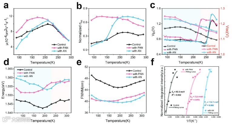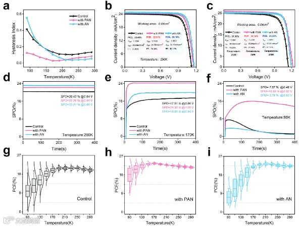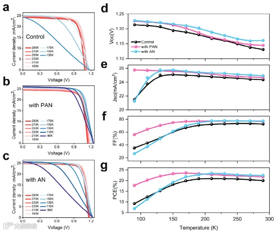 图3. 对照,PAN、和AN修饰PSCs的低温器件性能表征