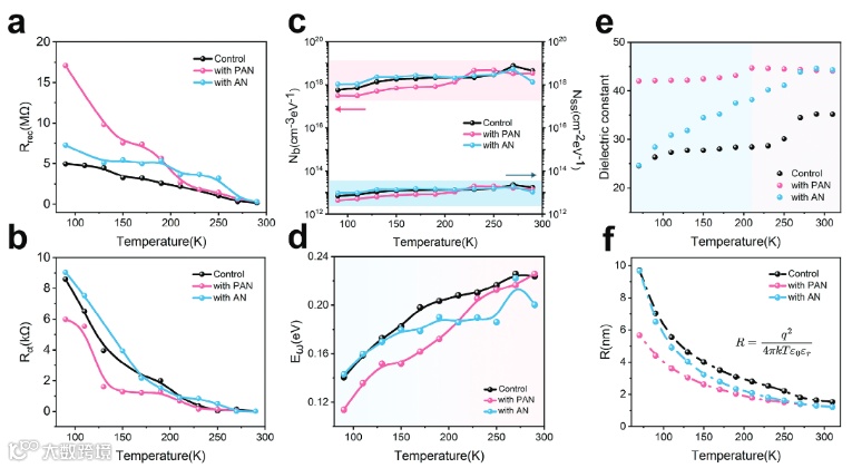 通过原位J-V测试获得了钙钛矿太阳电池性能参数随温度的演化规律(图1和图2)。结果表明,抑制JSC和FF在低温下的衰减对于实现低温下高效稳定的PSC至关重要。与对照组相比,PAN修饰的器件在290-90 K温度范围内其性能得到了全面改善,而且PAN的添加延缓了器件性能下降的拐点,显著抑制了JSC和FF在低温下的急剧恶化,缓减了低温下电流迟滞现象,增强了PSCs在低温下运行可靠性和可重复性,在150 K下实现了24.34% 的最大PCE。表明PAN修饰的PSCs在低温环境下具有更大的应用潜力。
