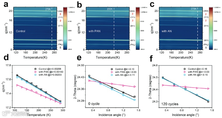 图4. 钙钛矿薄膜温度依赖的XRD表征以及温度循环前后钙钛矿薄膜GIXRD的2𝜃–𝜔关系曲线。