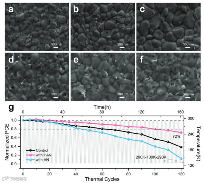 为了验证PSCs的热循环稳定性,本文对钙钛矿薄膜和器件进行了290 ~ 130 K的温度循环测试,温度间隔为40 K,每个完整循环持续时间为1.35 h。SEM像显示60个温度循环后(7d-f)对照组的钙钛矿膜形貌严重退化,出现了许多由有机成分逸出引起的缺陷孔,而PAN修饰的钙钛矿膜经过变温循环测试后表现出优异的形貌稳定性。此外,PAN修饰器件经过120个温度循环(160 h)后,仍保持了归一化初始PCE的72%,表现出良好的热循环稳定性。